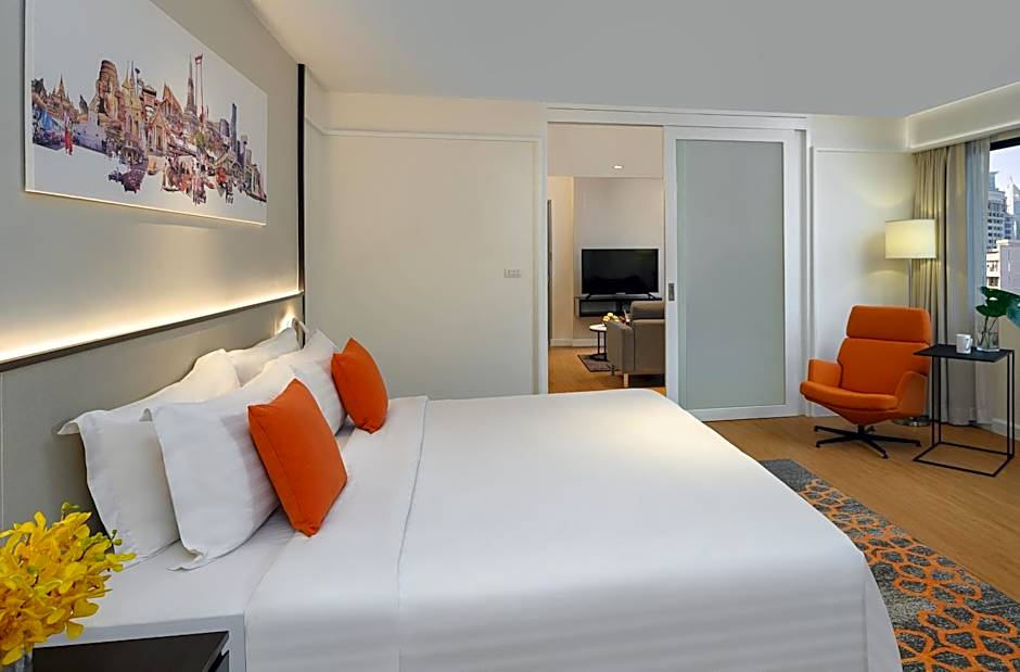 This spacious suite consists of 1 living room, 1 separate bedroom and 1 bathroom with a shower and free toiletries. Guests can make meals in the kitchenette that is equipped with a stovetop, a refrigerator, kitchenware and a microwave. The air-conditioned suite provides a flat-screen TV with cable channels, a washing machine, soundproof walls, a mini-bar as well as city views. The unit offers 1 bed.